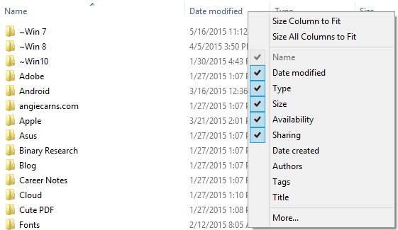 In my last post, Finding Recent Files, I mentioned using Detail View to sort by date. Clicking the headers in Detail View will sort any of the columns. To help your search you can call up more columns by right-clicking on the header row to get a list of available columns.